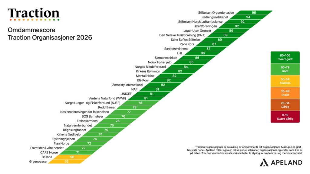 I Traction Organisasjoner 2026, som gjennomføres av Apeland og Norstat, måles 34 norske organisasjoners omdømme i befolkningen. Hele 20 av dem får «Svært godt» omdømme, med en Traction-score på 80 eller høyere. Dette betyr at det er høy tillit til norske organisasjoner, og at mange er svært godt likt. Av andre organisasjoner kommer Redningsselskapet på andreplass med 94 poeng, mens Stiftelsen Norsk Luftambulanse og Kreftforeningen deler tredjeplassen med 92 poeng. I 2024 kom Stiftelsen Organdonasjon på fjerdeplass med 90 poeng, og viser dermed til en økning på fem poeng.